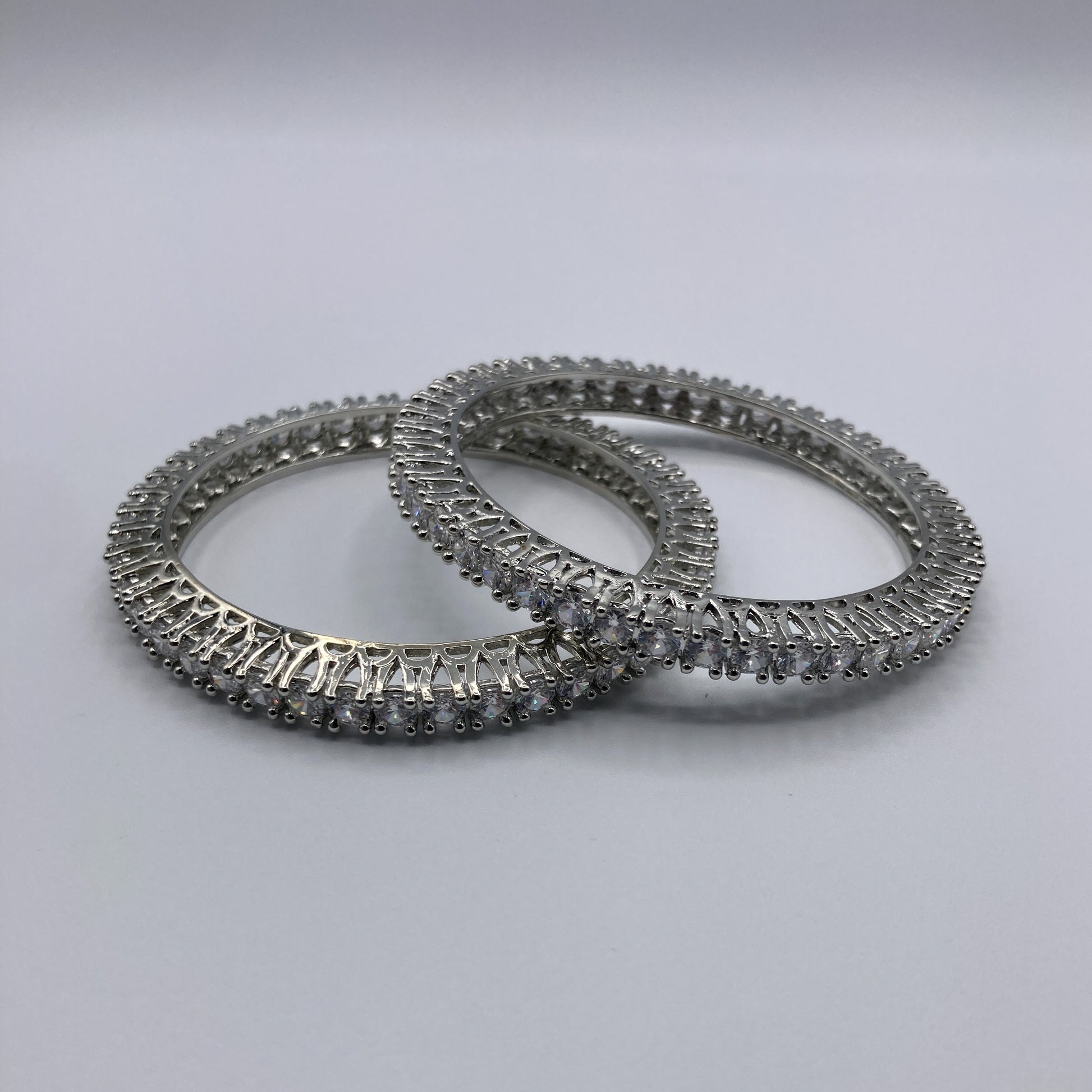 Glamorous set of silver bangles adorned with rows of sparkling clear crystals, creating a brilliant, diamond-like shine. This sophisticated pair offers a timeless elegance, ideal for enhancing formal attire or adding sparkle to casual looks. Perfect for stacking or gifting to jewelry enthusiasts.